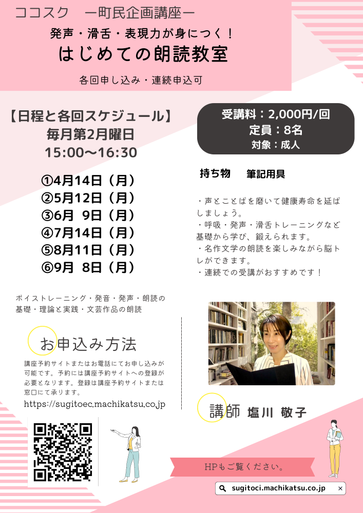 【町民企画講座】発声・滑舌・表現力が身につく!はじめての朗読教室(連続講座・各回申込可) |