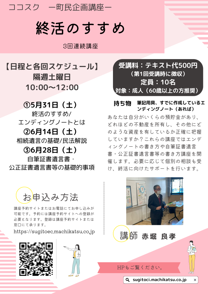 あなたは自分がいくらの預貯金があり、どれほどの不動産を保有し、その他にどのような資産を有しているか正確に把握していますか?こちらの講座ではエンディングノートの書き方や自筆証書遺言書・公正証書遺言書等の書き方講座を開催します。必要に応じて個別の相談も受け、終活に向けたサポートを行います。