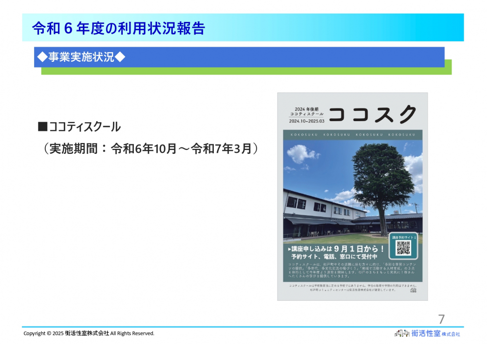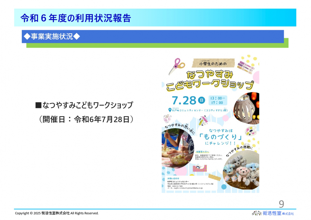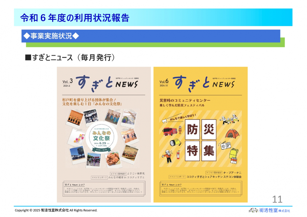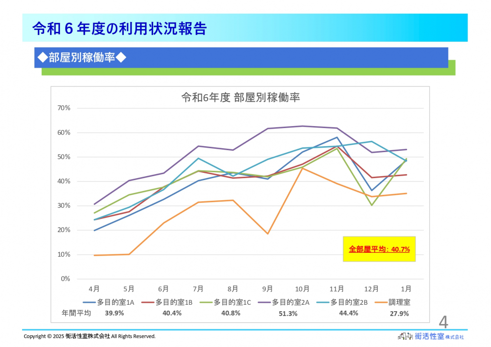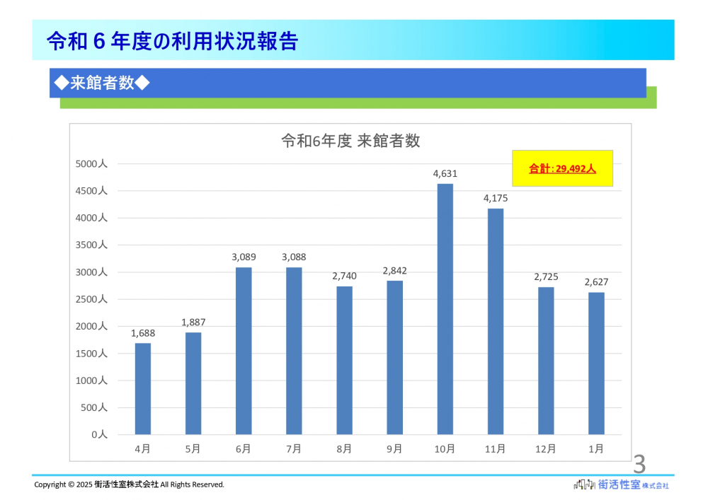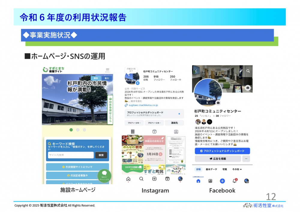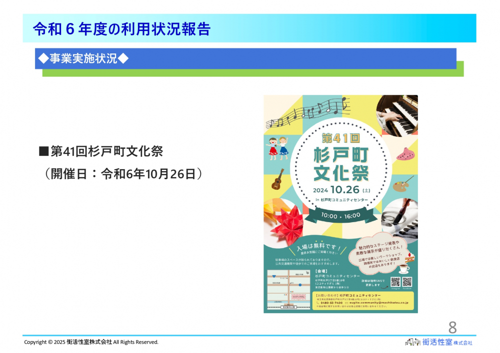 3月9日(日)に「令和6年度 杉戸町コミュニティセンター利用者懇談会」を開催しました。 当センターからは、令和6年度の利用状況と利用者アンケートの結果についてご報告いたしました。 皆さまからいただいた貴重なご意見は、今後のセンター運営の改善に活かしてまいります。 これからも、より快適にご利用いただける施設を目指してまいりますので、どうぞよろしくお願いいたします。 ※「令和6年度利用者アンケート」の結果については別ページにて公開しております。