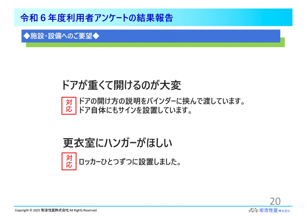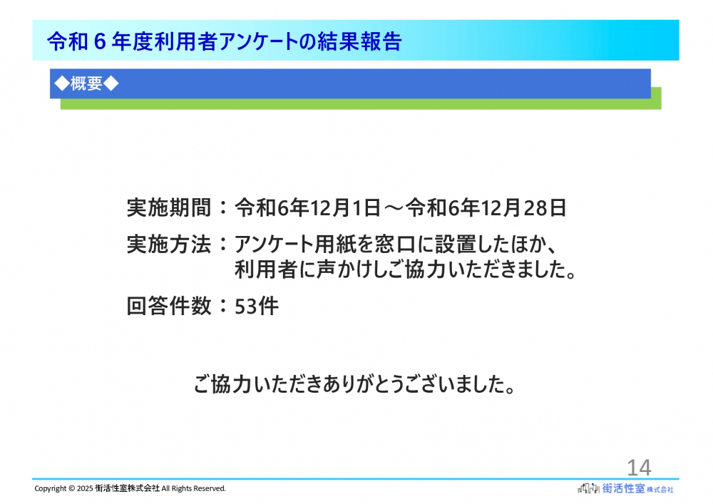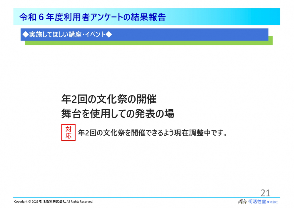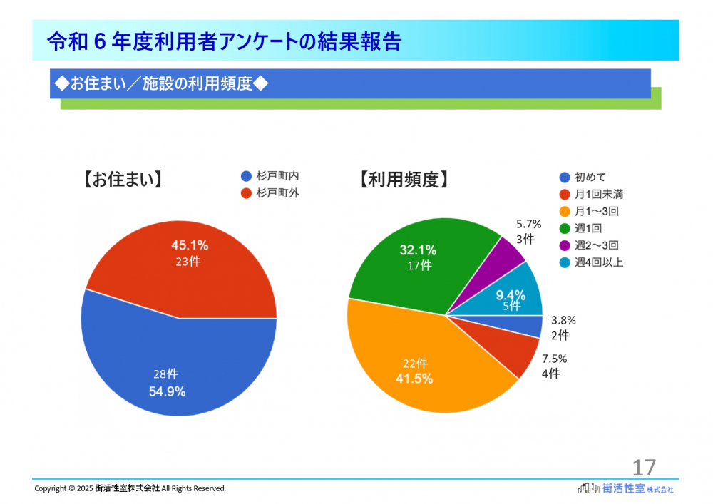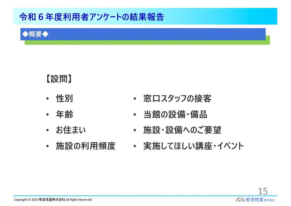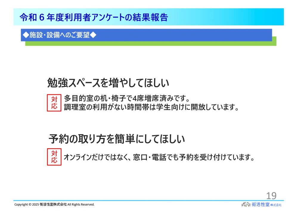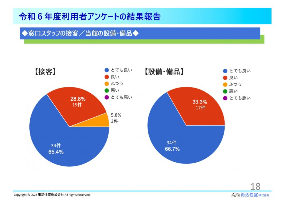「令和6年度 杉戸町コミュニティセンター利用者アンケート」を実施いたしました。 結果をご報告いたします。 アンケートの結果は、今後のセンター運営の改善に活かしてまいります。 これからも、より快適にご利用いただける施設を目指してまいりますので、どうぞよろしくお願いいたします。