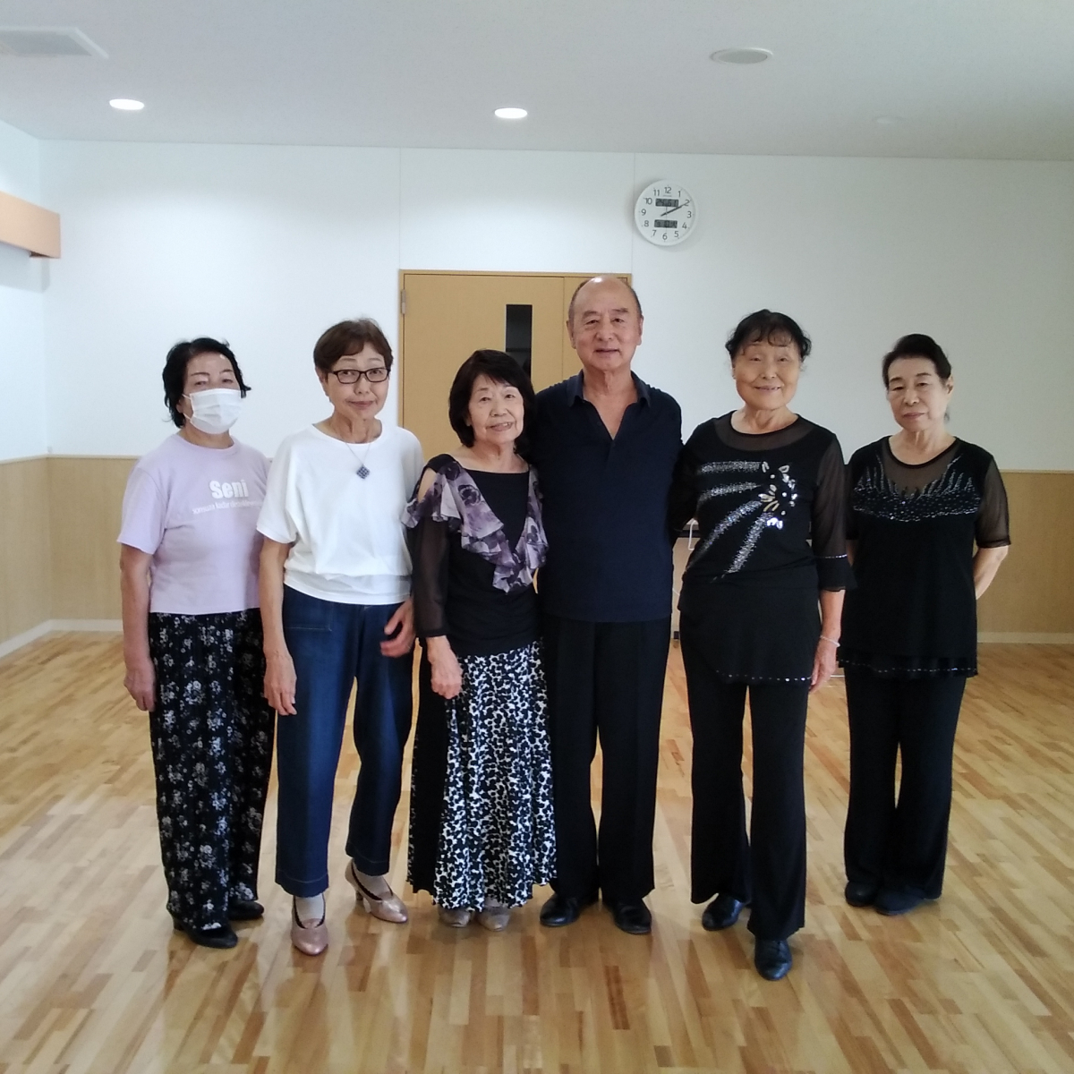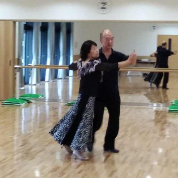 社交ダンスのグループです。新しく入会した方にも合わせて経験者も基礎から学んでいます。 少人数ですから順番に教えてもらえるのが嬉しいですね。大きな鏡の部屋で気持ちよくレッスンをしています。
