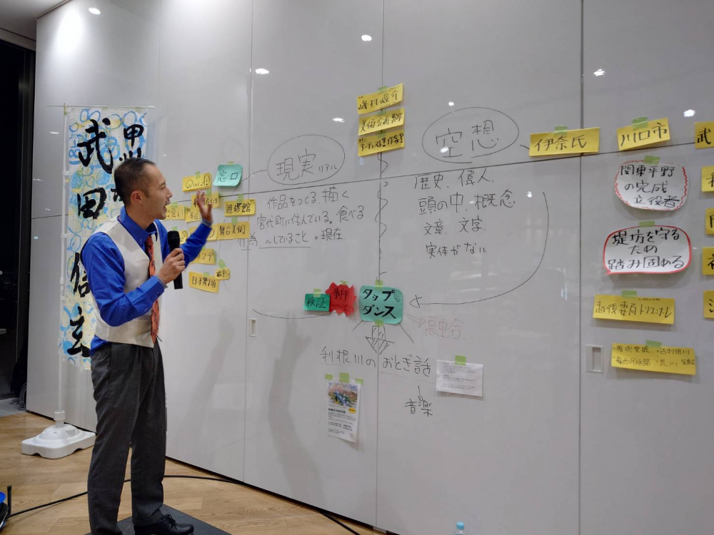 峰村さんは会場の大きい壁にキーワードの書いてある紙をいくつか貼り、それを使いながら「タップダンスに出会った事件」の真相を語っていきます。