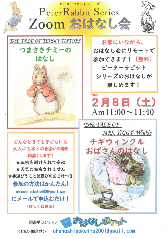 図書ボランティア「おはなしポケット」さんより、ピーターラビットシリーズ、Zoomおはなし会のお知らせです📚