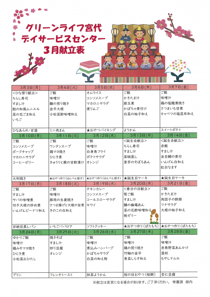 🌸グリーンライフ宮代デイサービスセンター3月の予定です🌸