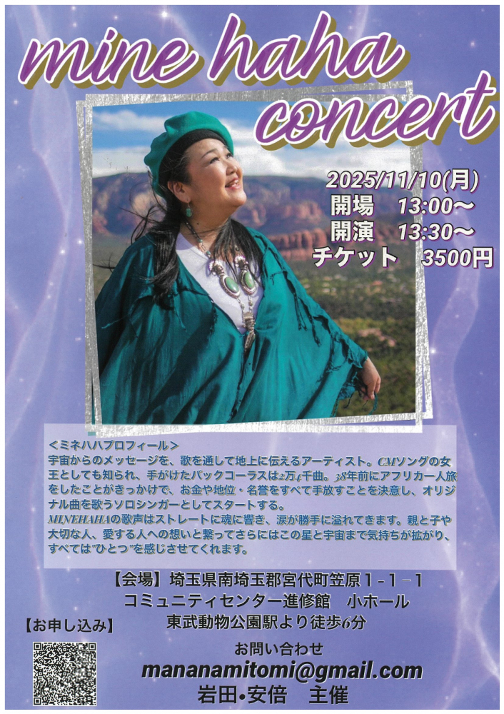 MINEHAHAの歌声はストレートに魂に届き、涙が勝手に溢れてきます。親と子や大切な人、愛する人への想いと繋ってさらにはこの星と宇宙まで気持ちが拡がり、すべては”ひとつ”を感じさせてくれます。
