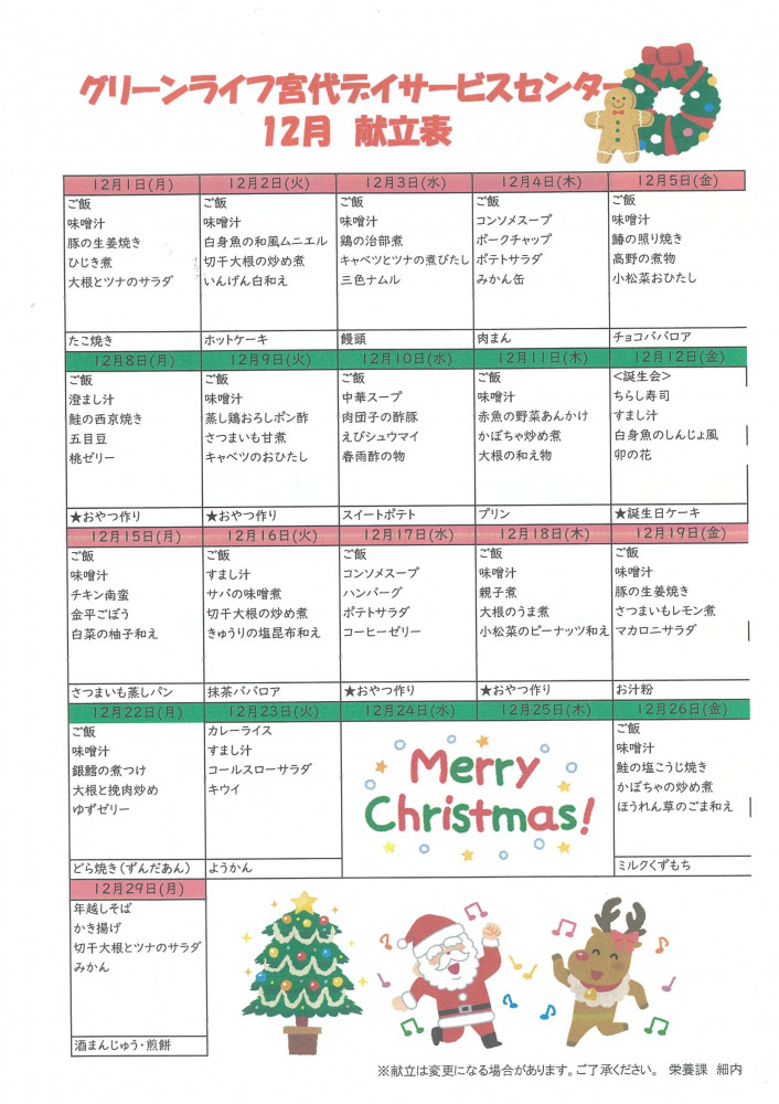 グリーンライフ宮代デイサービスセンター12月の予定です‼️