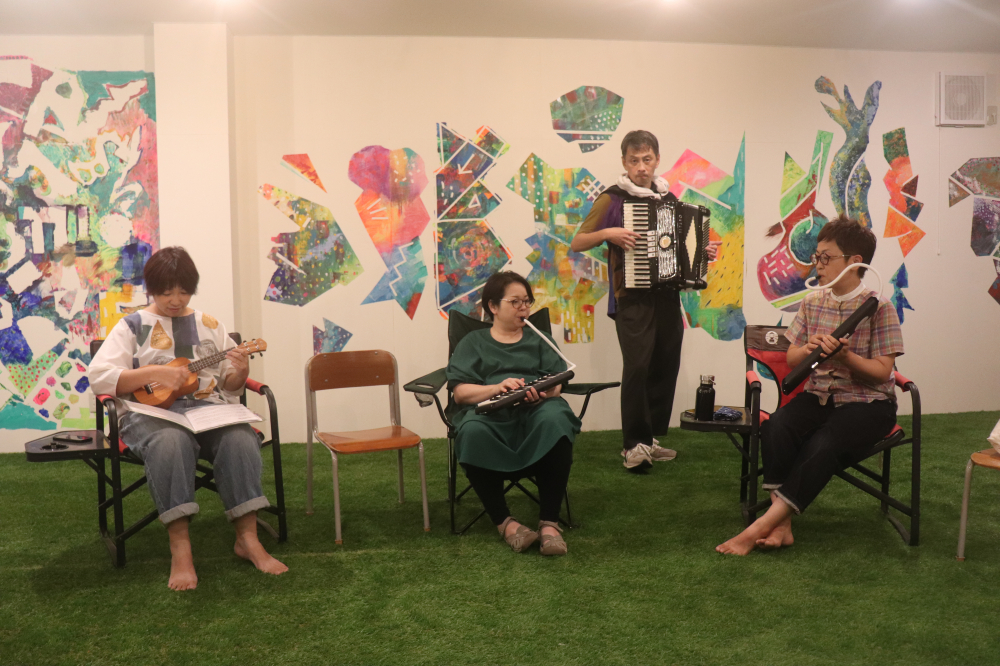 ミロッツは、新藤さんのアコーディオンや矢口さんの鍵盤ハーモニカを中心に、ウクレレ、タンバリンなど身近な楽器で構成されています。また、斎藤さんは、楽器は持たずに衣装のスタイリング担当として参加しています。それぞれの人が、音楽に限らず自分の得意な事を生かして関わっています。
